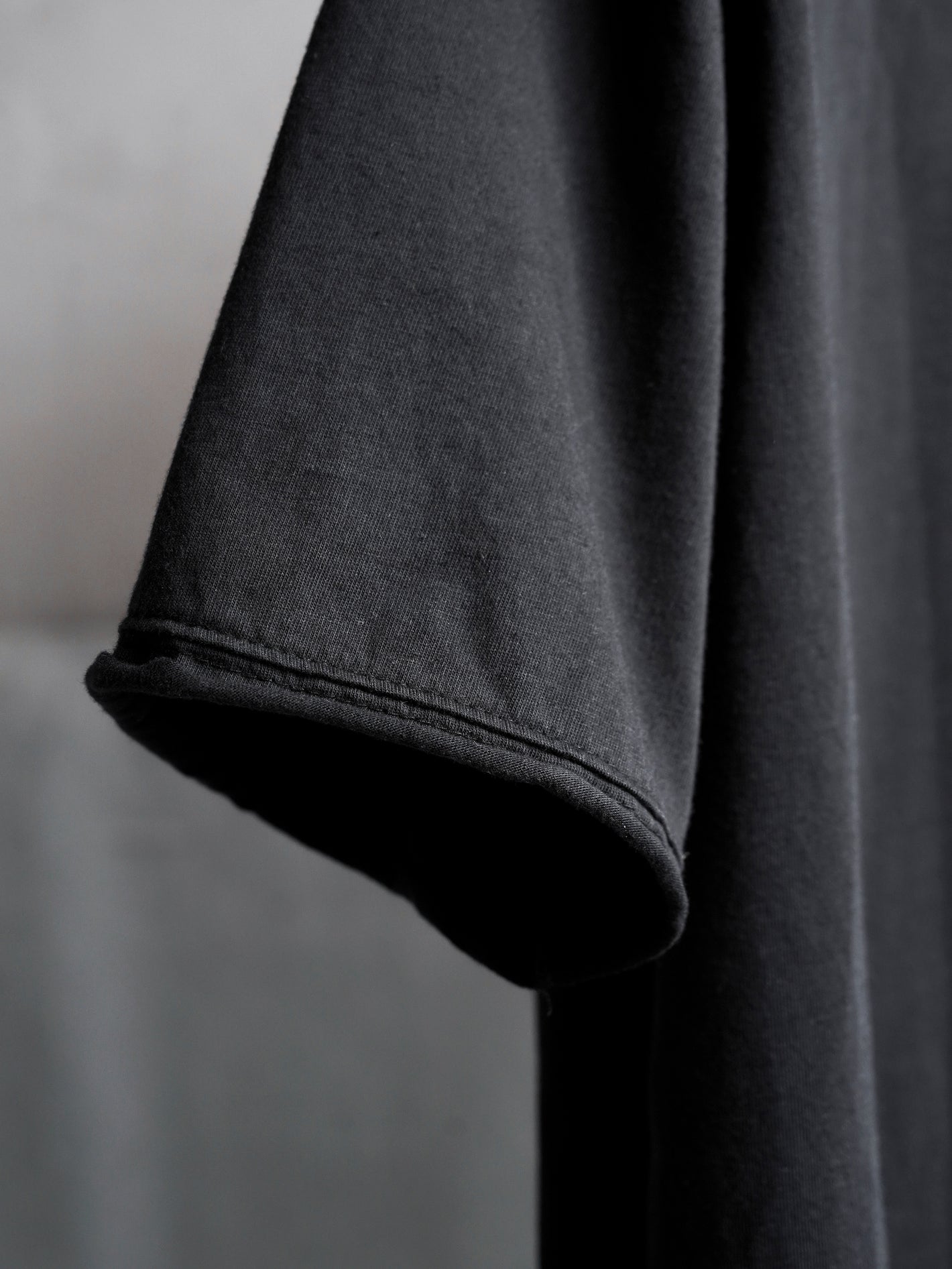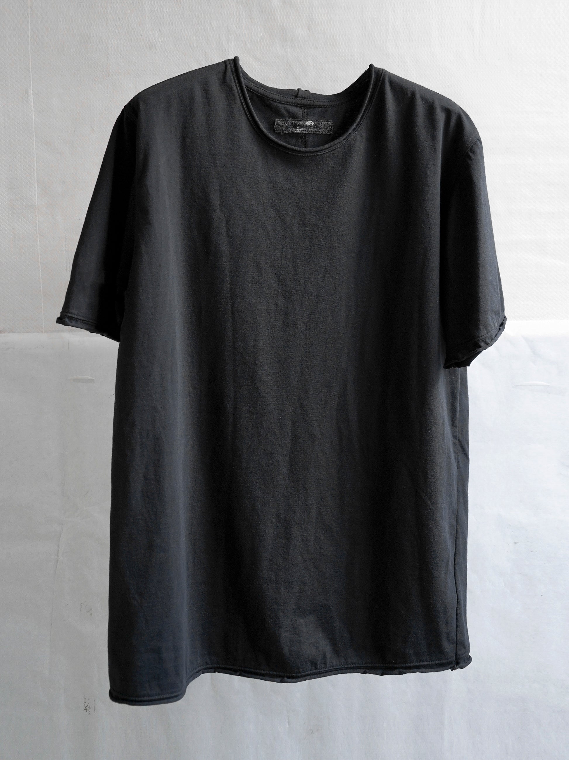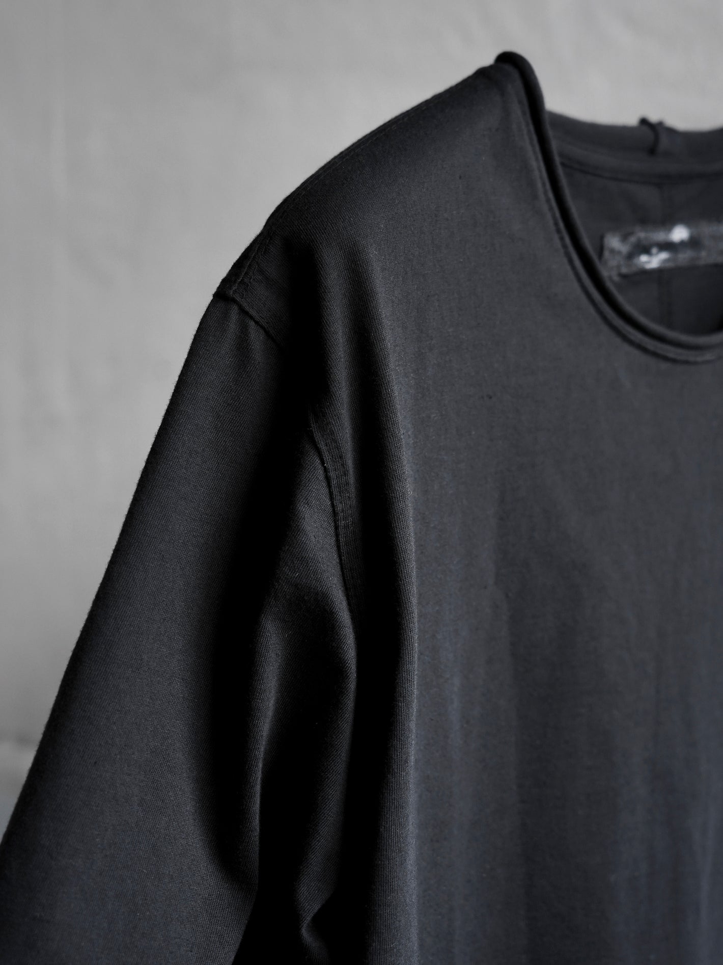 Raw rolled edge neckband, sleeve/body hem, back seam