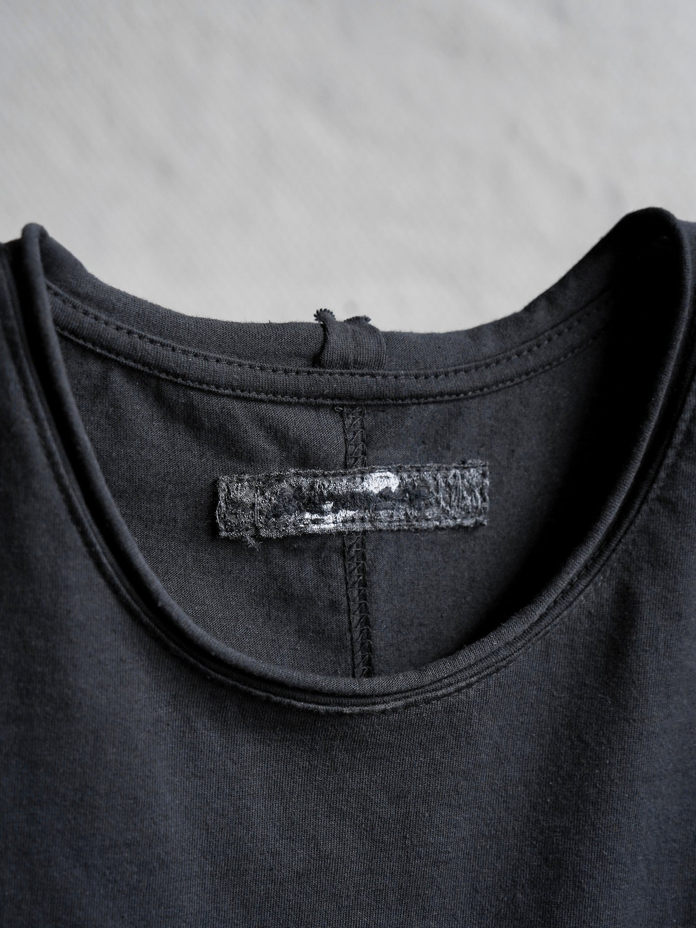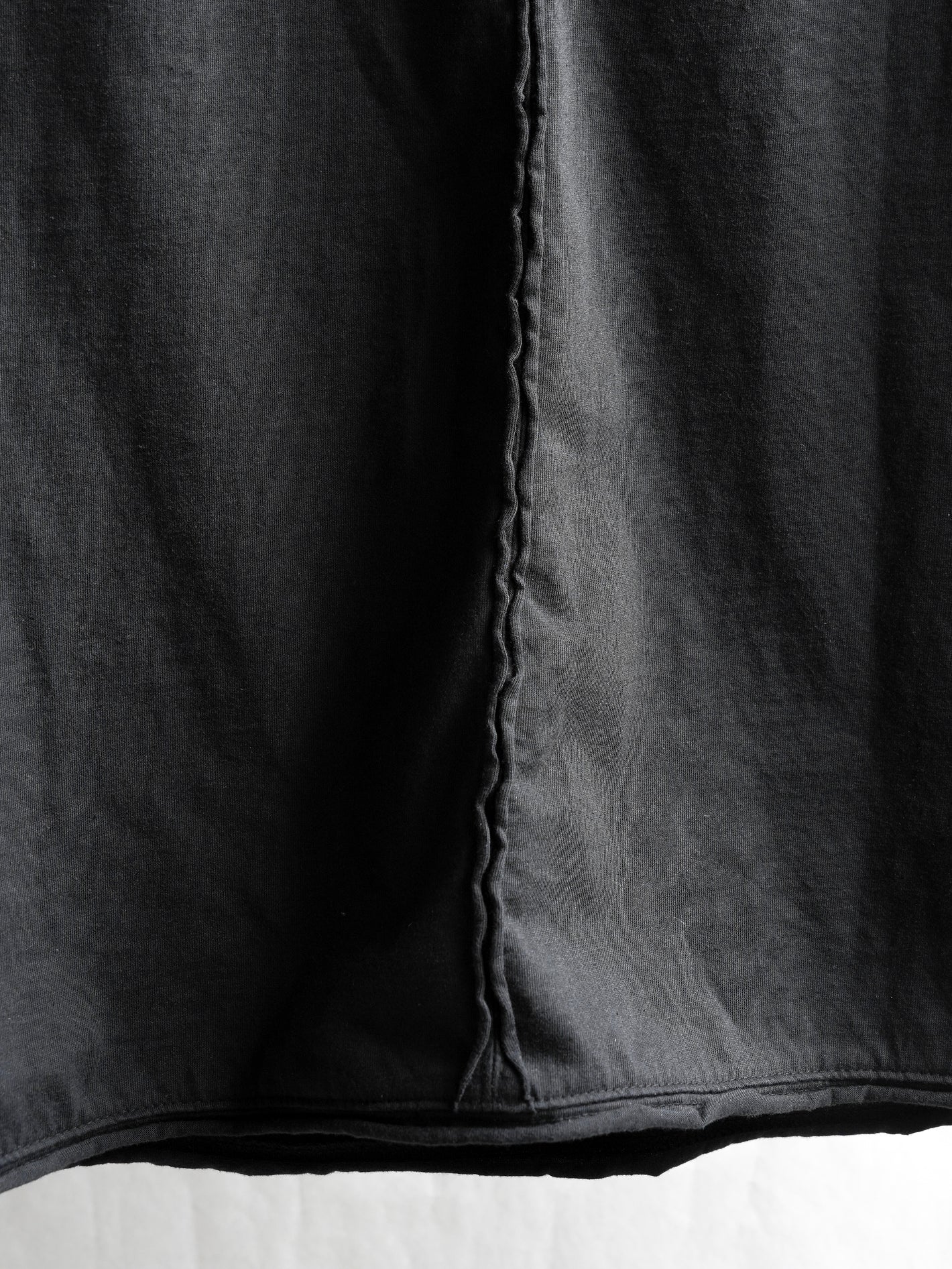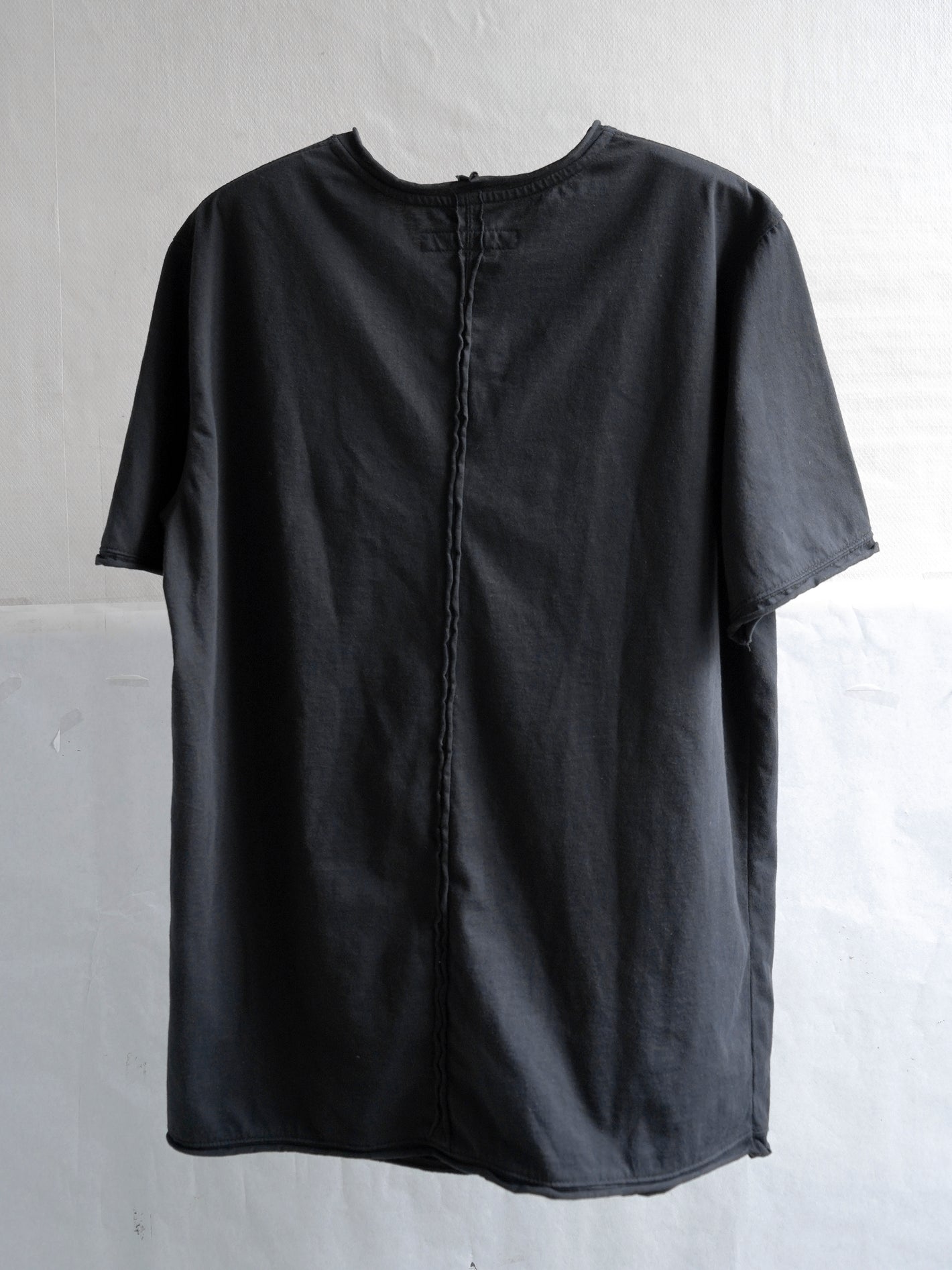 Raw rolled edge neckband, sleeve/body hem, back seam