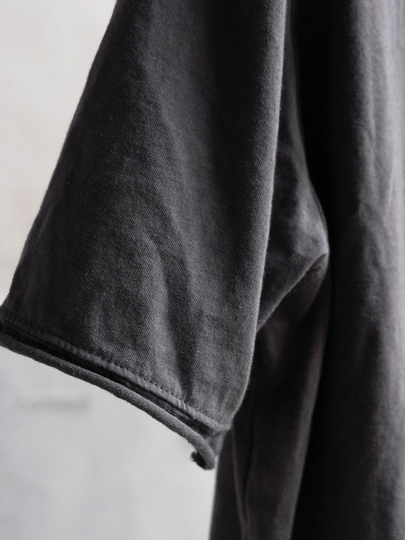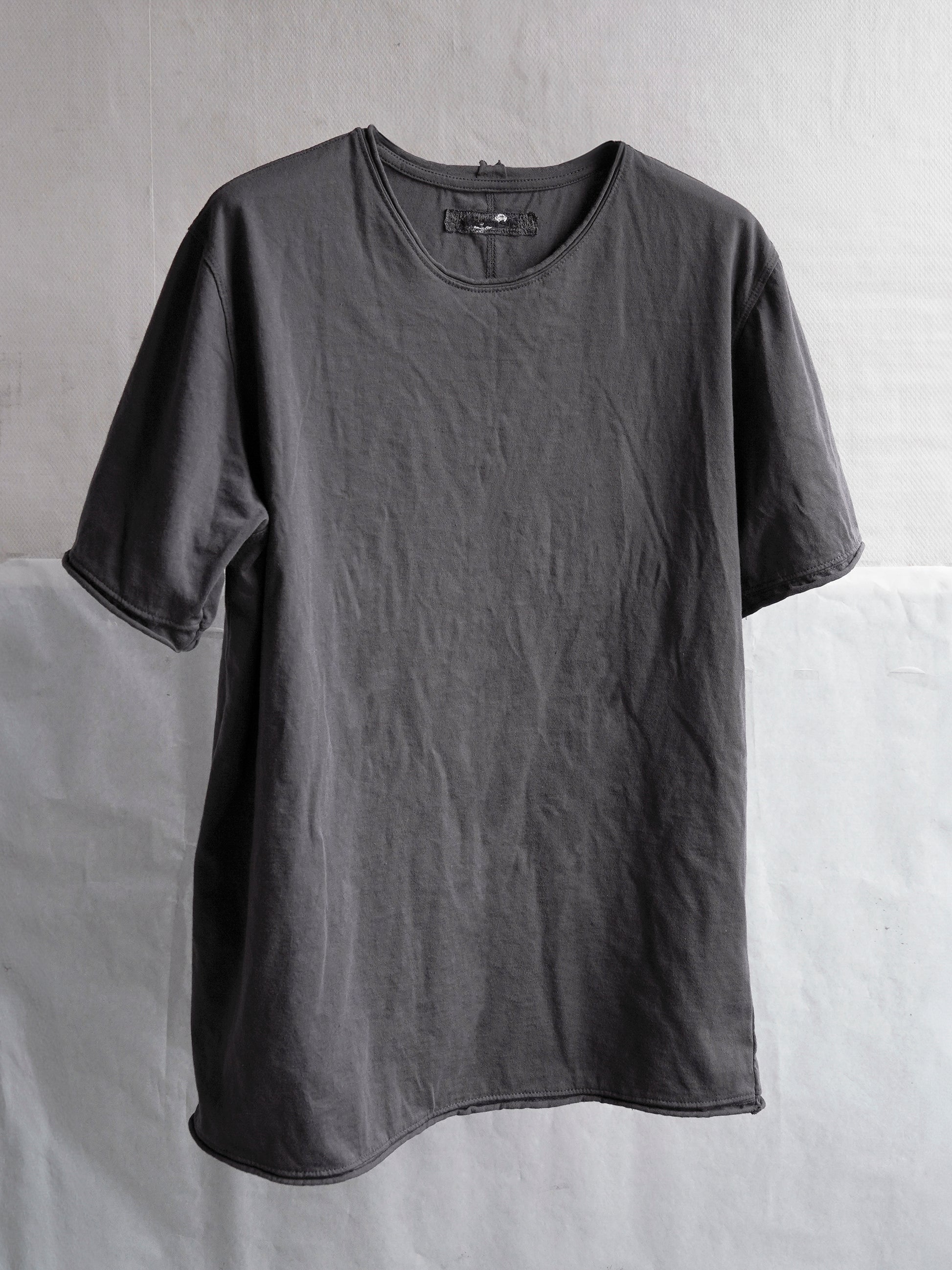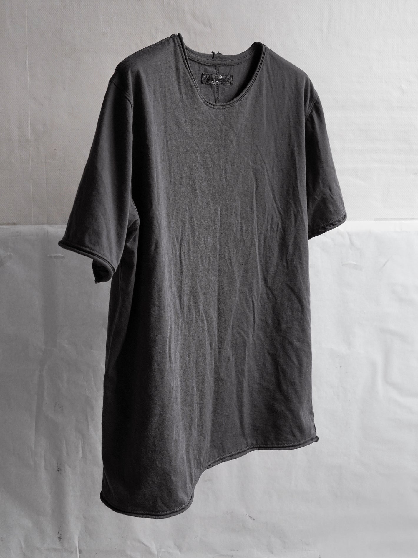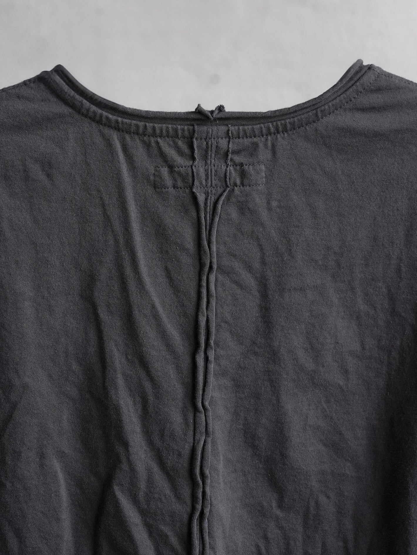 Raw rolled edge neckband, sleeve/body hem, back seam