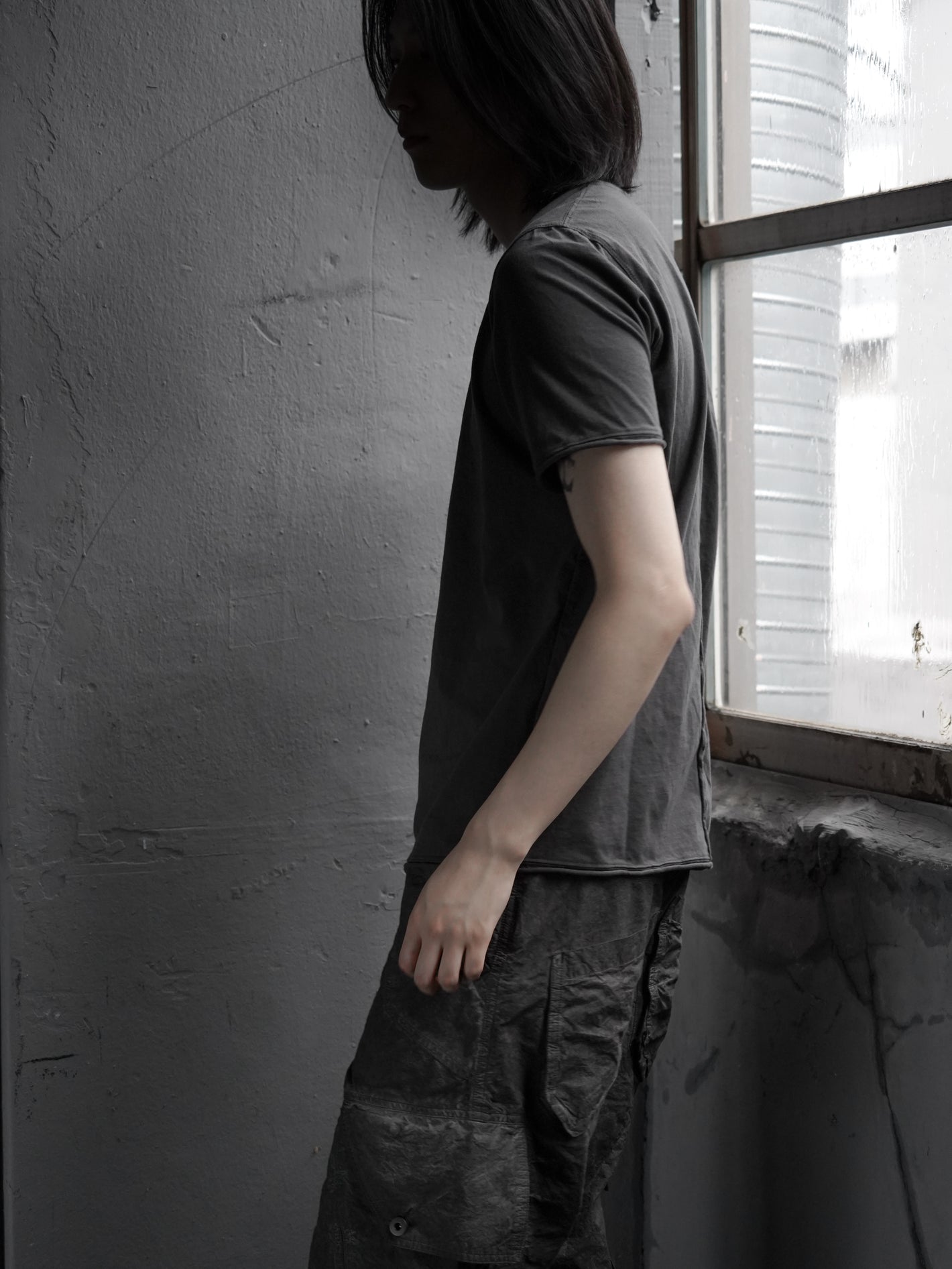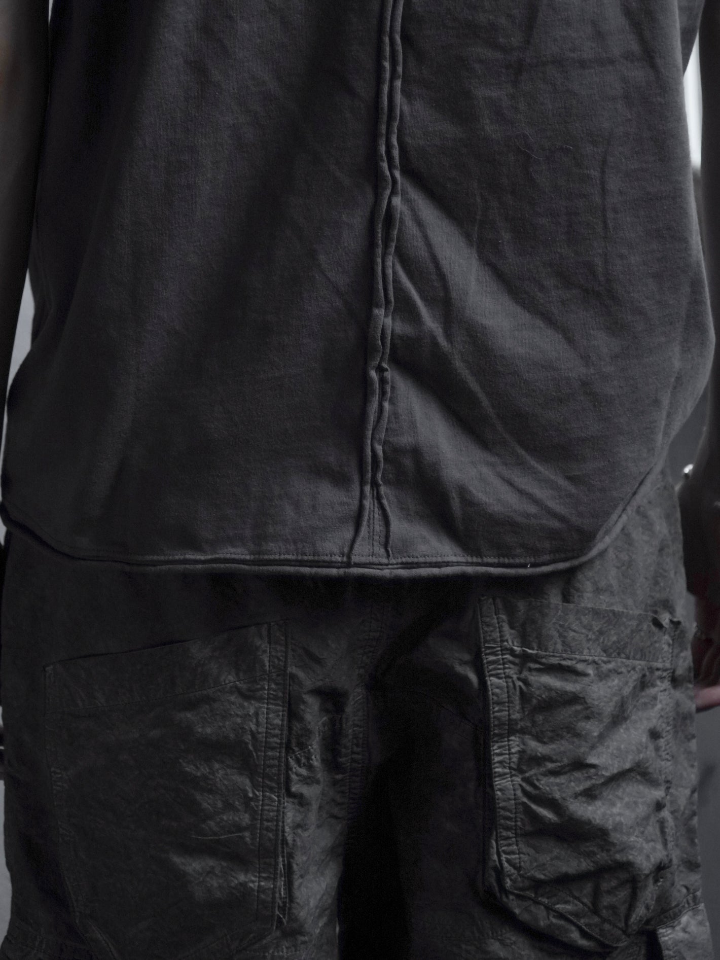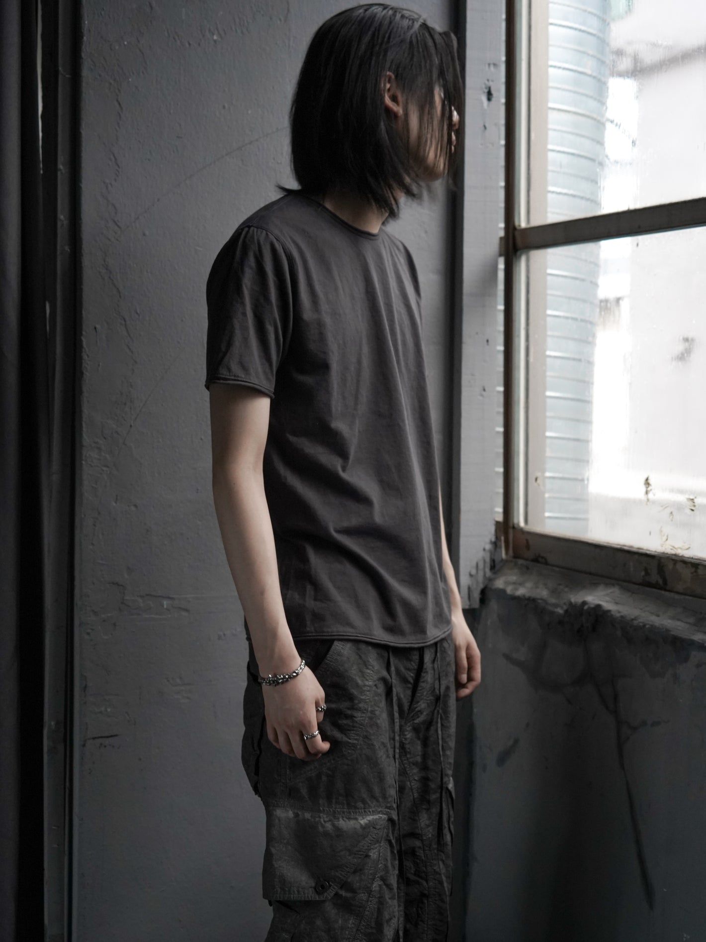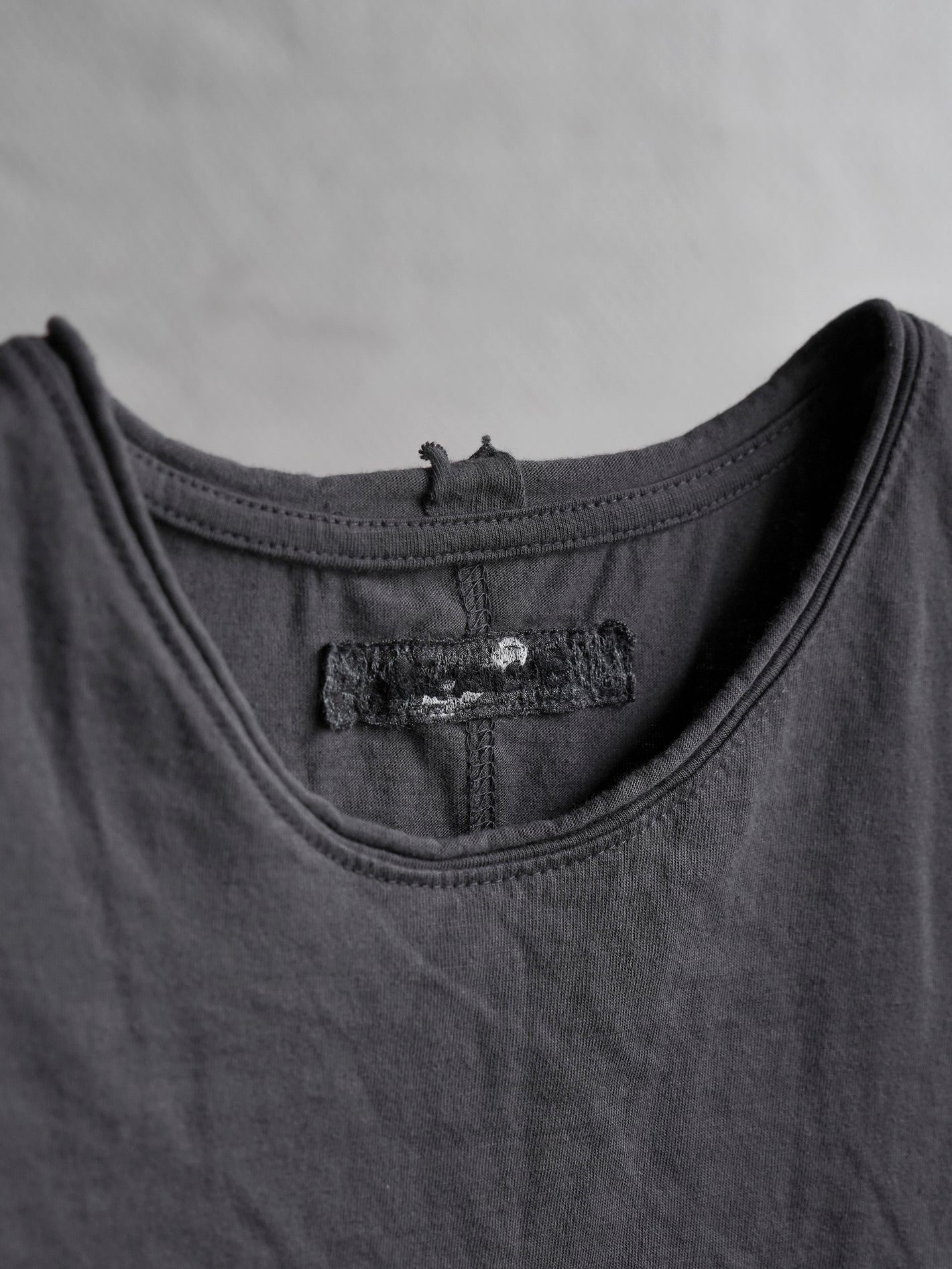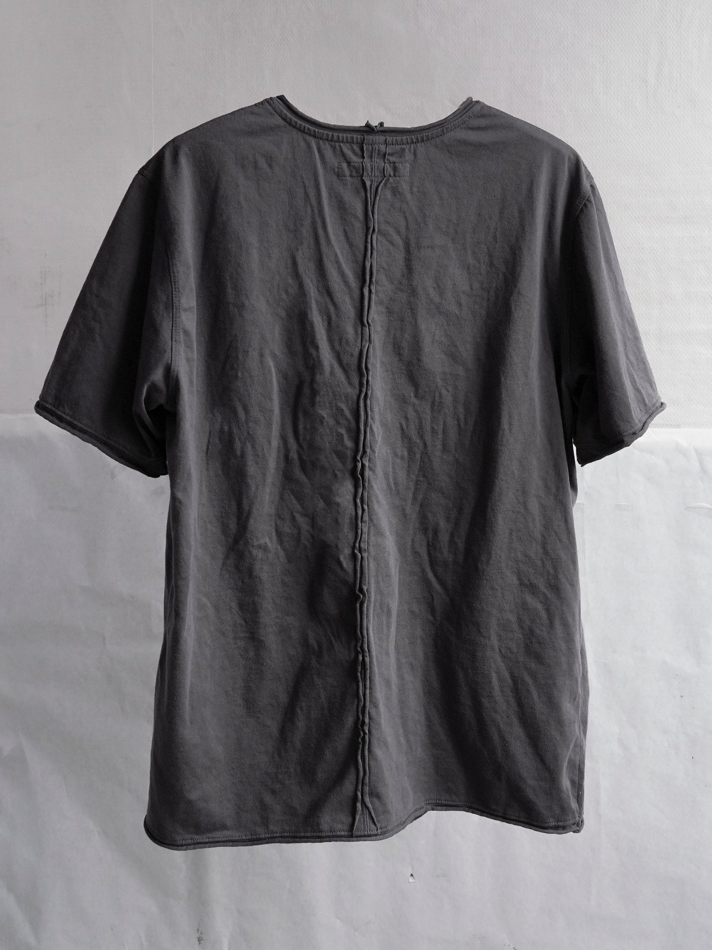 Raw rolled edge neckband, sleeve/body hem, back seam