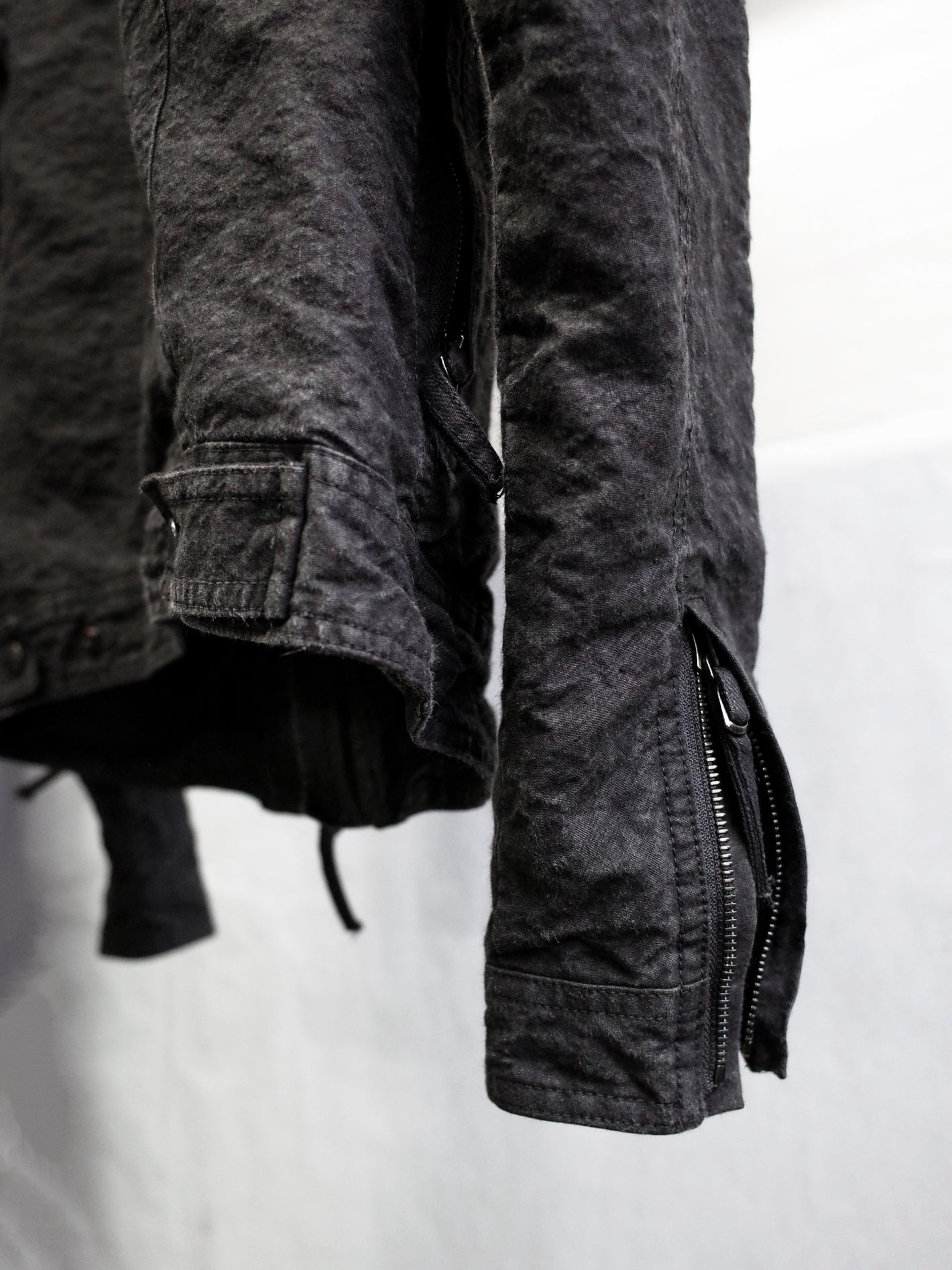 At the garment state, after sewing, overdyed once again in sumi ink